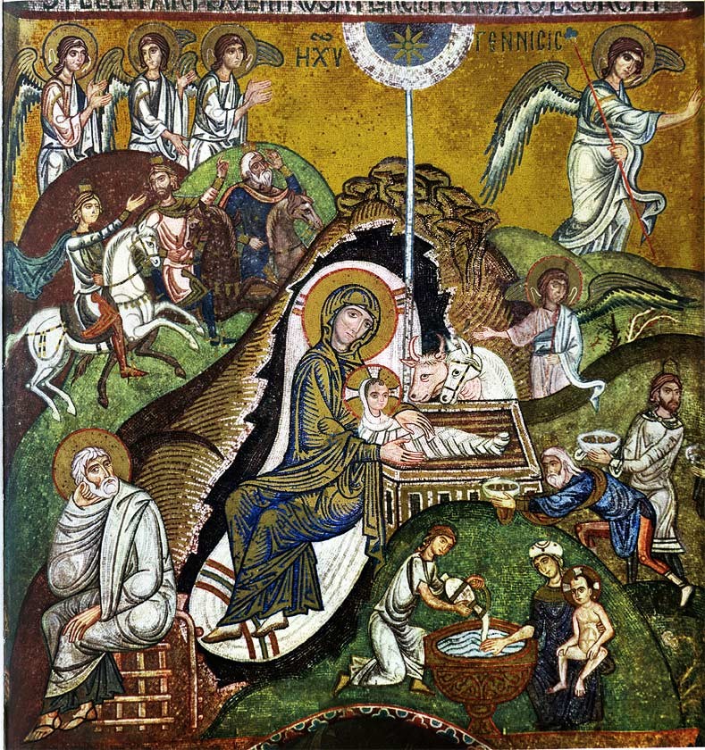 - Nativitat, mosaic bizantí, segle XII, Capella Palatina, Palermo, Italià: