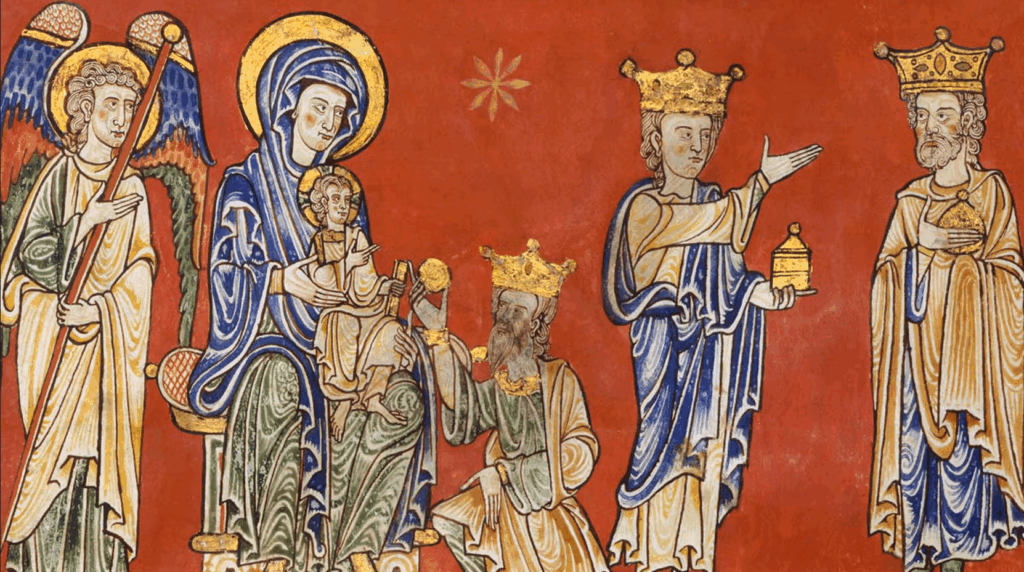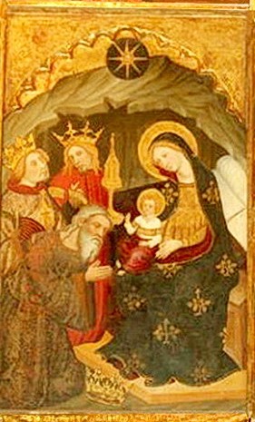 - Retaule del Sant Esperit, Pere Serra, 1394. Col·legiata Basílica de Santa Maria de Manresa. Detall de l’Epifania a un dels carrers del costat esquerre: