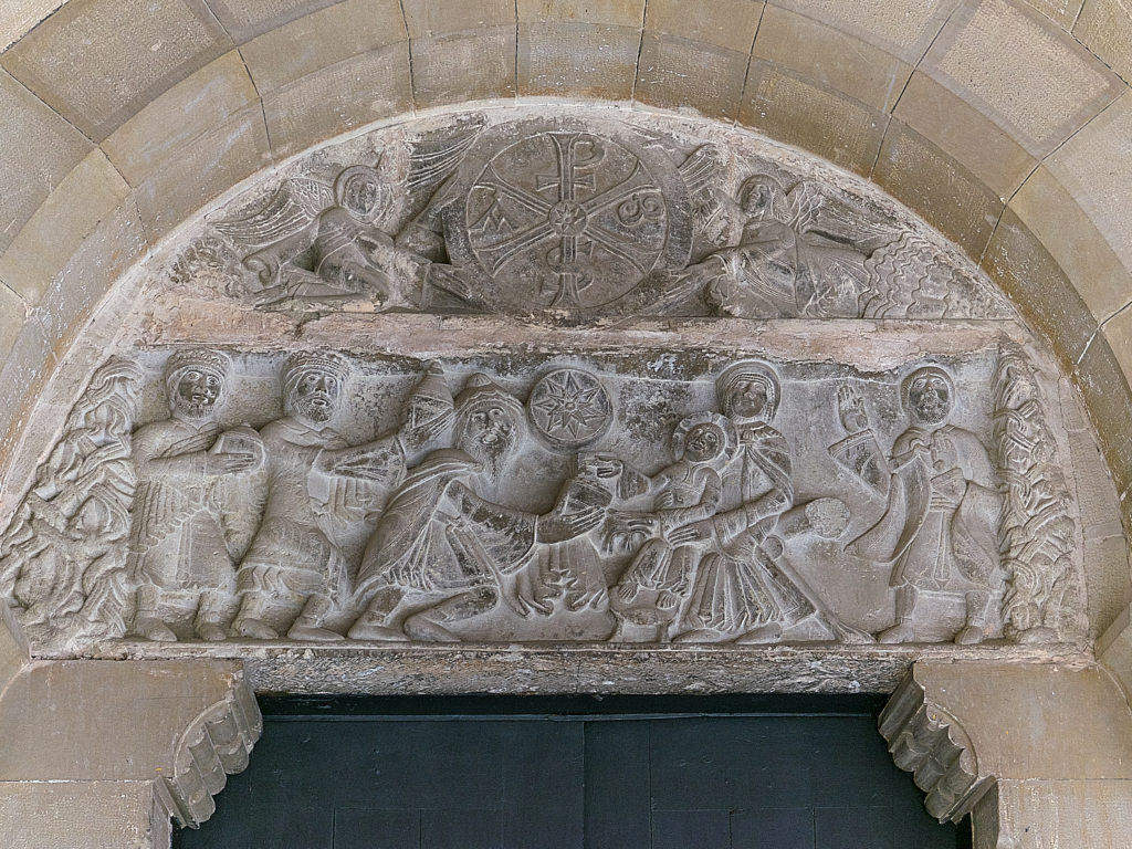 - Crismó (part superior) i Epifania (part inferior), relleu en pedra, segle XII, Claustre de San Pedro el Viejo. Osca, Aragó: