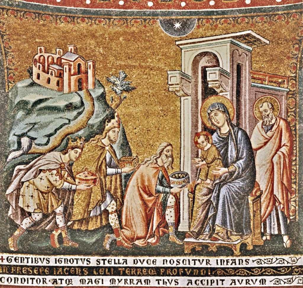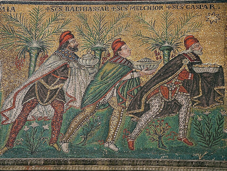 - Els tres Mags, mosaic bizantí, c 565, Basílica de Sant Apollinare Nuovo, Ravena, Italià. Es considera la primera imatge on apareix el nom dels Reis d’Orient, tal com els coneixem avui en dia.