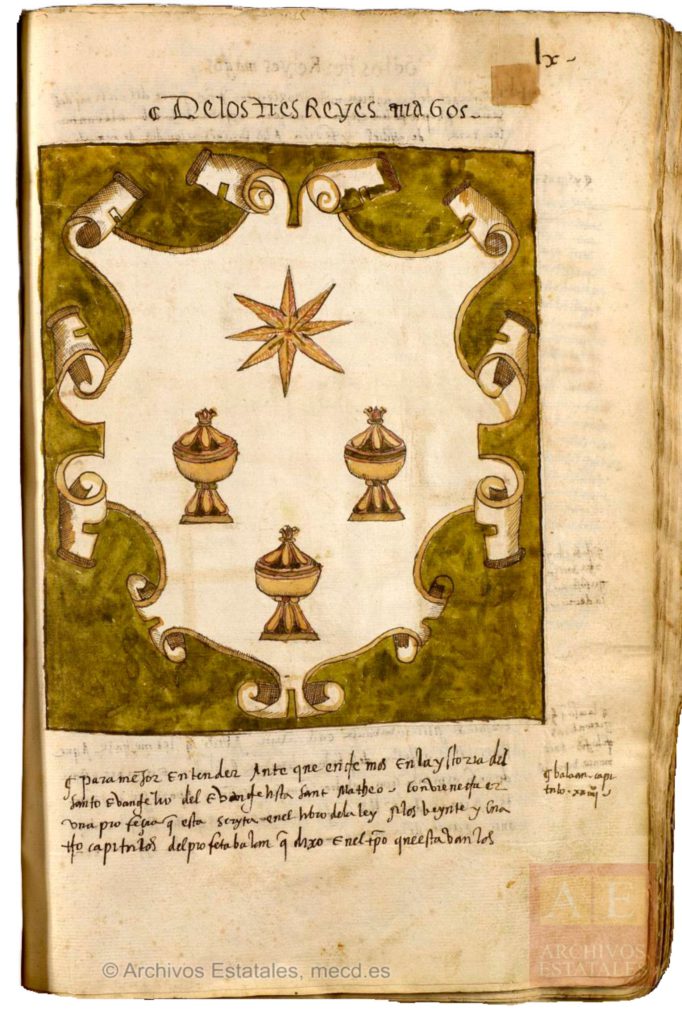 - Per acabar, una imatge curiosa i menys coneguda. La creixent popularitat dels Reis va fer que, cap a finals de l’edat mitjana, alguns il·lustradors inventessin escuts dels Reis d’Orient. Gràcies a un tractat conservat en l’Arxiu Històric de la Noblesa (vegeu: AHNOB), podem conèixer l’estat d’aquesta tradició a mitjans del segle XVI. En un d’ells veiem, com no podia faltar, un estel de vuit puntes (3).