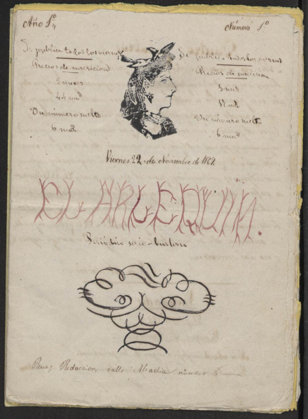 Next, we will show the two covers made by Gaudí before the September Revolution (to see the complete copies, see: Simurg. Digitized collections of CSIC. The copies of El Arlequín are currently preserved in Madrid, at the Tomás Navarro Tomás Library). The cover with the woman was published, as we have said, on November 22, 1867, being, for now, Gaudí’s first artistic display. The next is the cover with the harlequin motif and dates from December 2 of that same year.