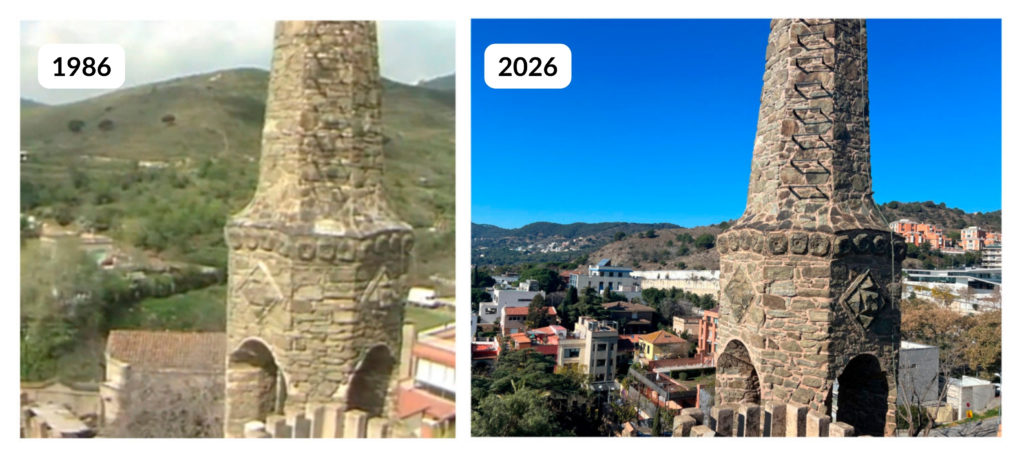Las nuevas edificaciones, además de eclipsar la obra de Gaudí, han limitado uno de los efectos principales que Gaudí tuvo en cuenta a la hora de su realización: el mimetismo de la fachada con el paisaje. Mirad la foto de 1886: la “piel exterior” de la torre‑castillo es áspera y verde como la montaña. No es ninguna casualidad: la piedra del revestimiento del edificio es original del lugar.