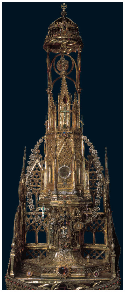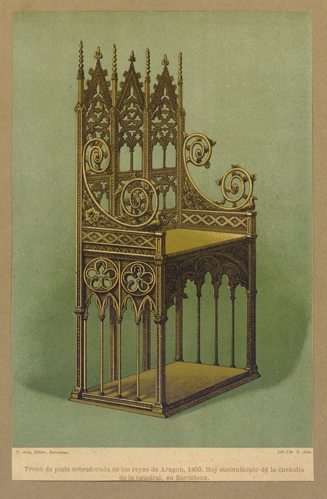Documentada a partir de 1320, la procesión del Corpus de Barcelona es la primera celebrada en España y una de las más antiguas de Europa. Tras la muerte del rey Martín, en 1410, su trono se utilizó como peana de la custodia. Desde entonces, durante la procesión del Corpus, trono y custodia recorren las calles del barrio gótico de la ciudad condal. A continuación, mostramos una imagen del trono, a través de un grabado antiguo donde se puede apreciar mejor su forma, y otra de la custodia completa.