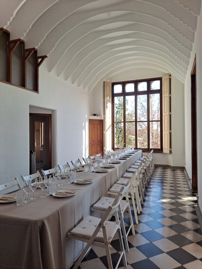 Hoy se ha celebrado una comida en la segunda planta de la casa. En la fotografía del evento podemos ver un elemento nuevo y otro con una larga historia. El nuevo es el techo con las características formas orgánicas de Gaudí, realizadas en yeso, un material maleable, con la capacidad de adoptar cualquier forma y resaltar la luminosidad de la sala. El antiguo es la ventana al final de la habitación. Una ventana característica de la arquitectura gótica, aunque, como era de esperar, convenientemente personalizada por Gaudí. Por ejemplo, cada columna del parteluz está forrada por un trencadis blanco, la famosa técnica inventada por el arquitecto. En algunas, el trencadis es de ceramica blanca, y, en otras, de pidera pizarra, como el resto de la fachada.