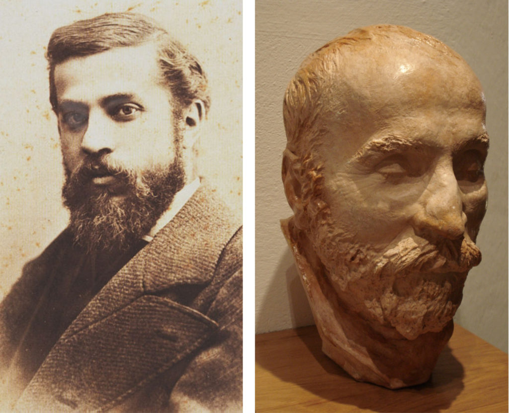Retrato de Antoni Gaudí I Cornet. 15 de marzo de 1878. Autor: Pablo Audouard, Font: Wikipedia./ Busto de Antoni Gaudí realizado a partir de la máscara mortuoria, la madrugada del 11 de junio de 1926. Joan Matamala. Font: web de la Sagrada Familia.