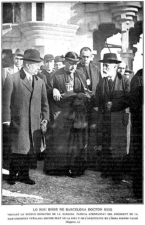Gaudí enseñando la Sagrada Familia al obispo de Barcelona, Enric Reig Casanova, y al presidente de la Mancomunidad de Catalunya, Enric Prat de la Riba, 30 de noviembre de 1914. Font: Wikipedia.