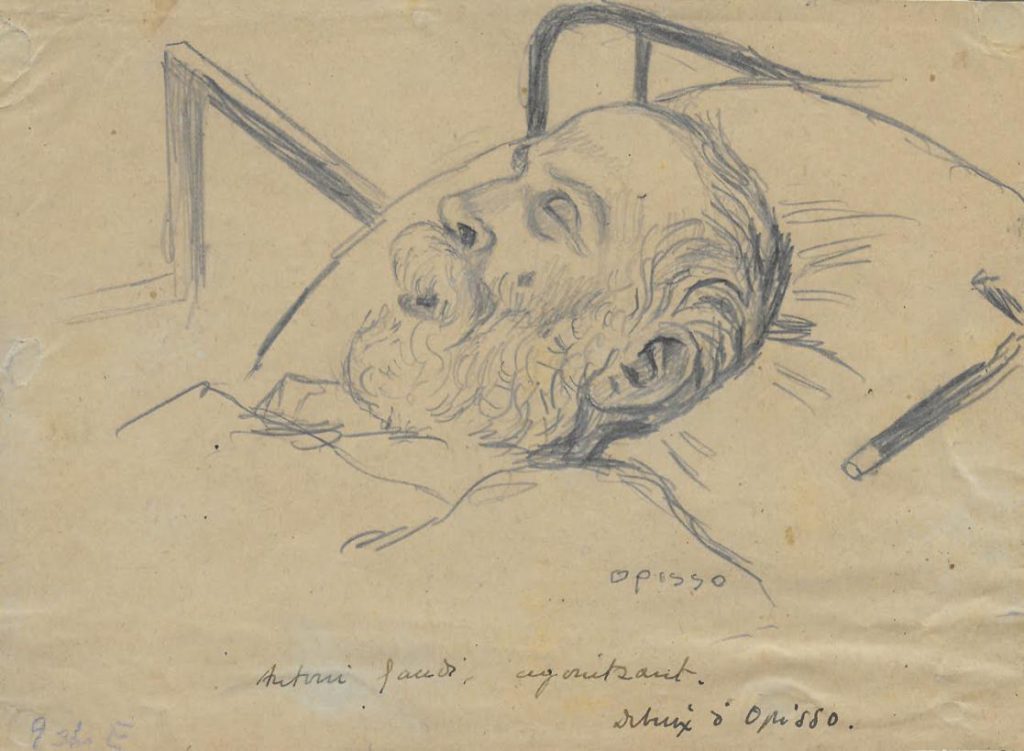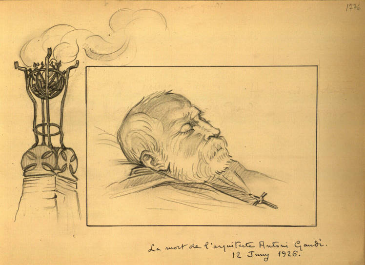 Al día siguiente, otro día 11, los principales diarios empezaron a hablar de la defunción. Para ilustrarla, se hicieron dos dibujos. Uno de ellos era de Ricard Opisso, un dibujante que empezó a trabajar en la Sagrada Família con doce años, como delineante, y que llegó a ser uno de los grandes cronistas gráficos de su tiempo (3). El segundo, lo firmaba Joaquin Renart, gran artista modernista que también fue presidente del Círculo Artístico de San Lucas y del Orfeón Catalán, dos instituciones que, como ya hemos dicho, estaban fuertemente vinculadas a Gaudí. Ahora bien, alguien más hizo una imagen postrera del maestro: el hijo de Llorenç, que también era escultor y siguió al frente de las obras de la Sagrada Família a la muerte tanto de su padre como del arquitecto.